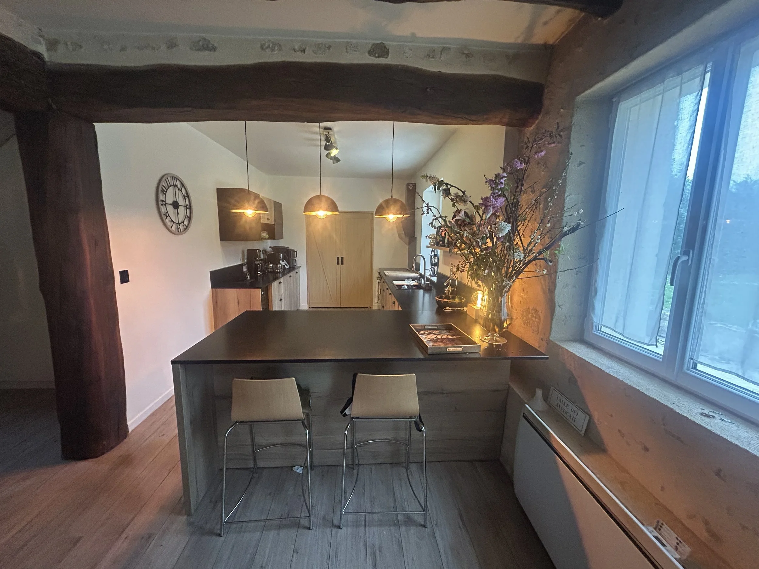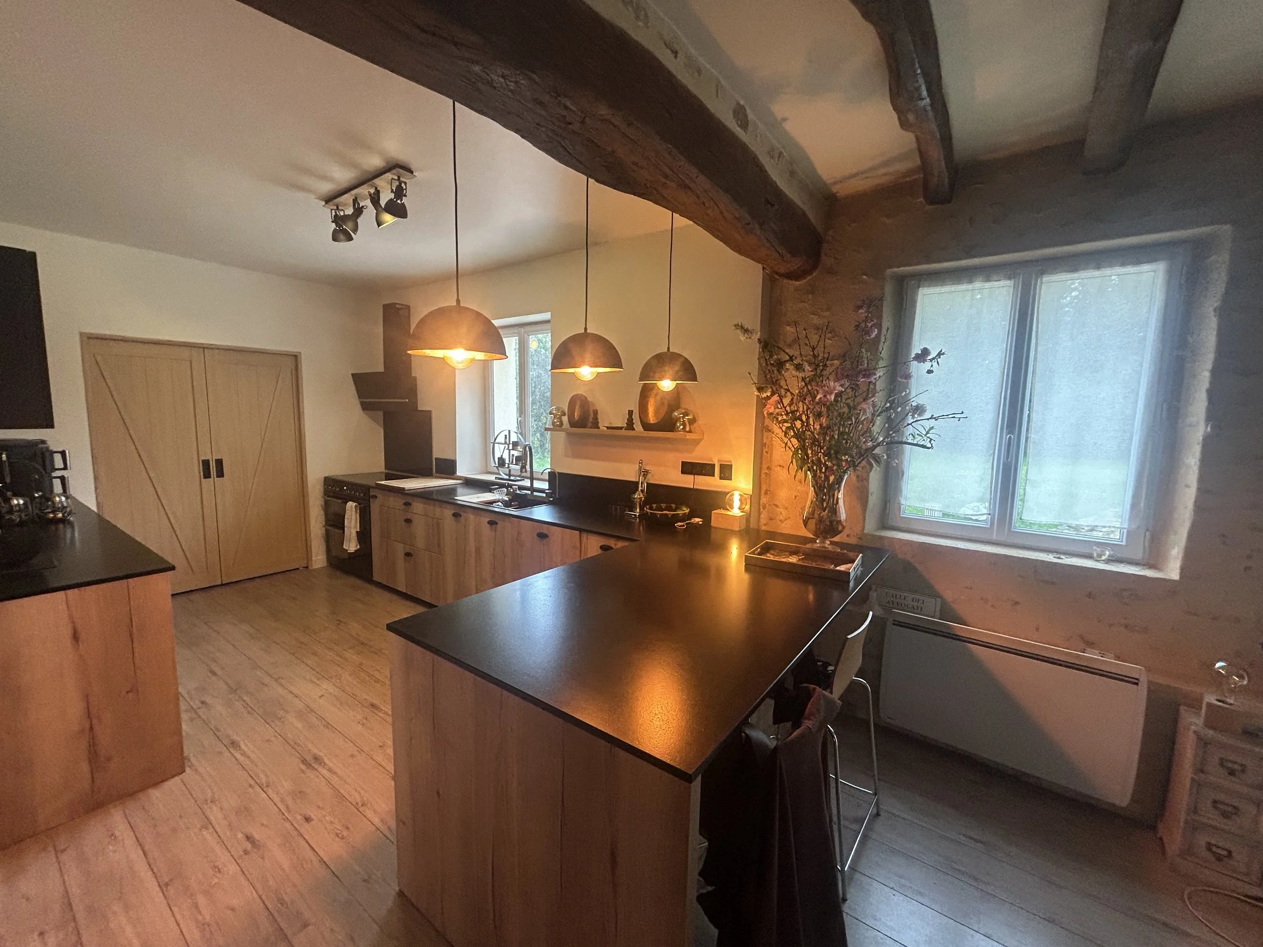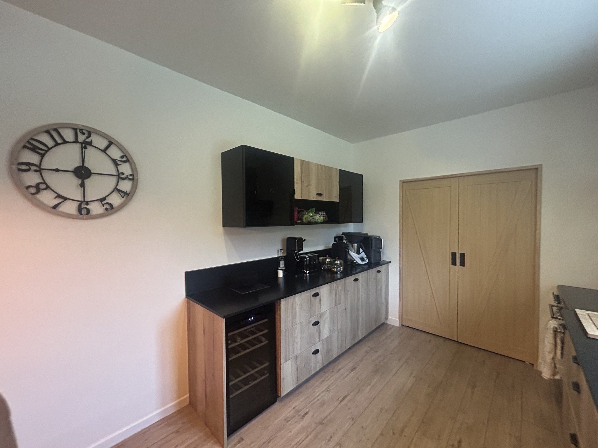 Cette rénovation transforme la cuisine en un espace moderne et fonctionnel. Les portes à galandage apportent un vrai gain de place et une circulation fluide, tout en offrant la possibilité de moduler l’ouverture de la pièce.